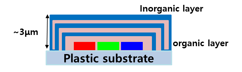 플라스틱 (고분자 또는 organic 소재)의 경우, 수분과 산소를 막는 것이 한계가 있어 기존의 세라믹 기반의 inorganic 소재를 다시 사용하게 됩니다. 그러나 플렉시블 디스플레이를 위해서는 세라믹 기반의 inorganic 소재를 나노 스케일로 얇게 코팅해, 기존의 세라믹이 갖지 못하는 유연성을 부여하였습니다. 그러나 얇은 두께의 inorganic 소재는 수분 산소 침투 보호 특성이 Bulk 특성에 비해 떨어지게 됩니다. 이를 위해, multi-layer개념이 도입되었습니다. 그러나 단순 세라믹 층을 여러번 쌓게 되면, 쌓는 과정에서의 표면 상태의 균일성이 떨어지기 때문에 inorgani, organic layer의 반복적인 구조의 multi-layer를 사용합니다. 이를 통해 산소와 수분이 침투를 방지하며, 침투하더라도 OLED의 발광 영역에 도달하는 확산 시간을 길게 만드는 구조를 연구하였습니다.