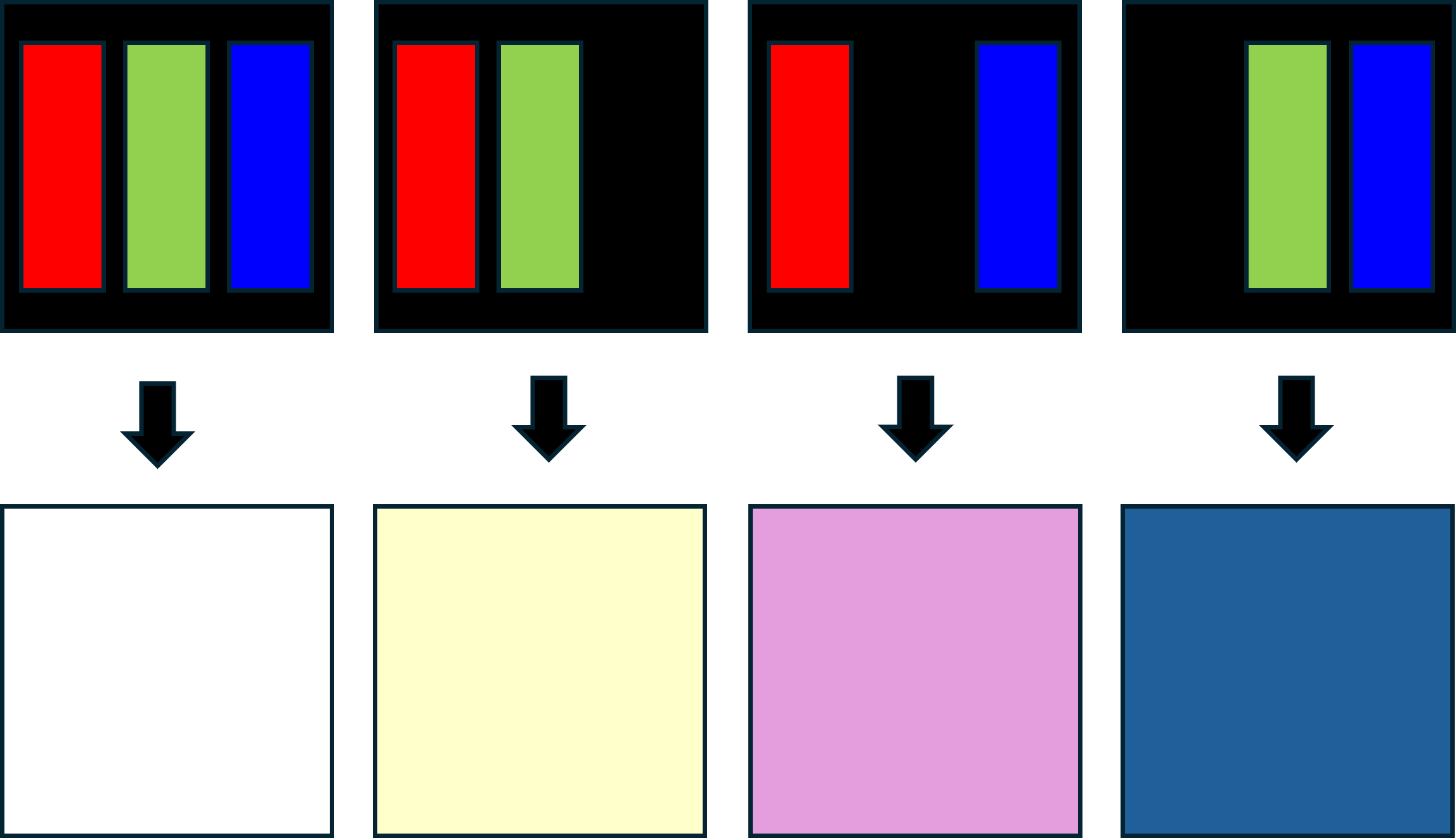 앞서 언급한 바와 같이 LCD의 BLU와 LC 구조는 빛의 양을 조절할 뿐 각각의 색을 조절하지는 못합니다. 때문에 각각의 픽셀의 색을 조절하기 위해서 컬러필터를 사용합니다. 컬러필터는 빛의 삼원색인 RGB를 사용합니다. 보통 3개의 컬러필터를 각각의 픽셀마다 배치를 하고, 액정과 편광판을 활용하여 빛의 양을 조절함으로써 색을 표현합니다. 이를 통해 RGB 색 뿐만 아니라 다양한 색을 구현합니다.