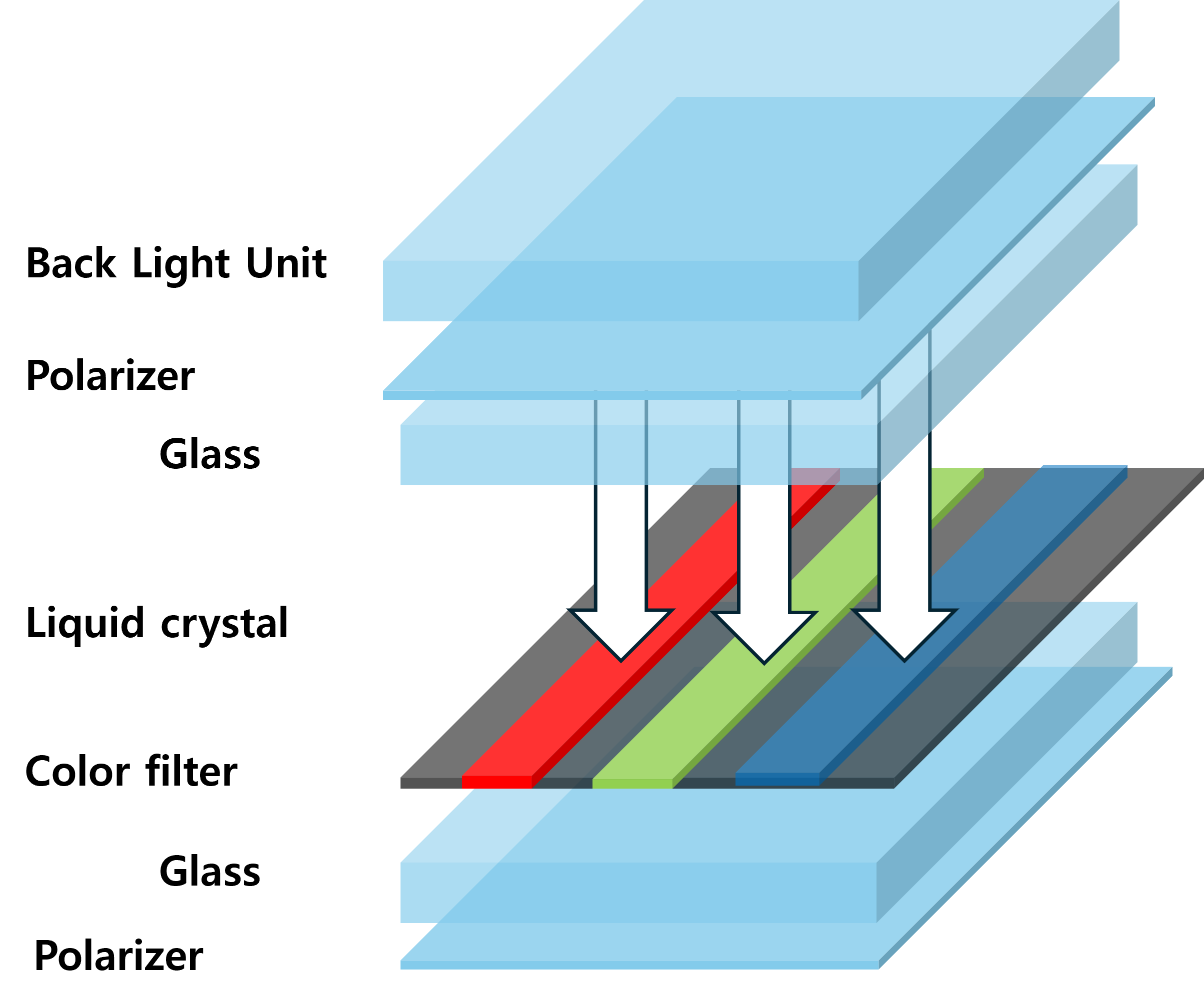 먼저, LCD는 제일 뒤쪽에 Back light Unit(BLU)를 사용하여 뒤쪽에서 발광체가 존재하였고 이를 투과해줄 수 있는 유리 기반의 소재를 활용하여 패널을 제작하였습니다. 그림과 같이 뒤쪽의 백라이트(BLU)가 존재하고, 액정, 편광판 및 컬러필터를 통해 빛이 전달됩니다.