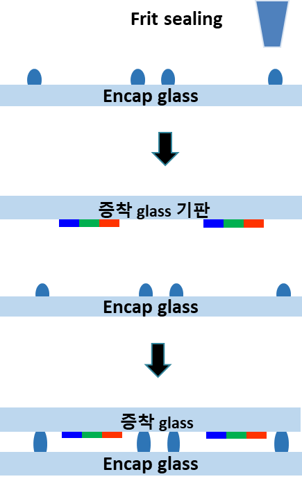 그리고 나서 Glass Frit의 용매(Solvent)와 바인더(binder)를 제거된 곳에 증착된 RGB 유리 기판을 올려서 Encap 층을 제작합니다.